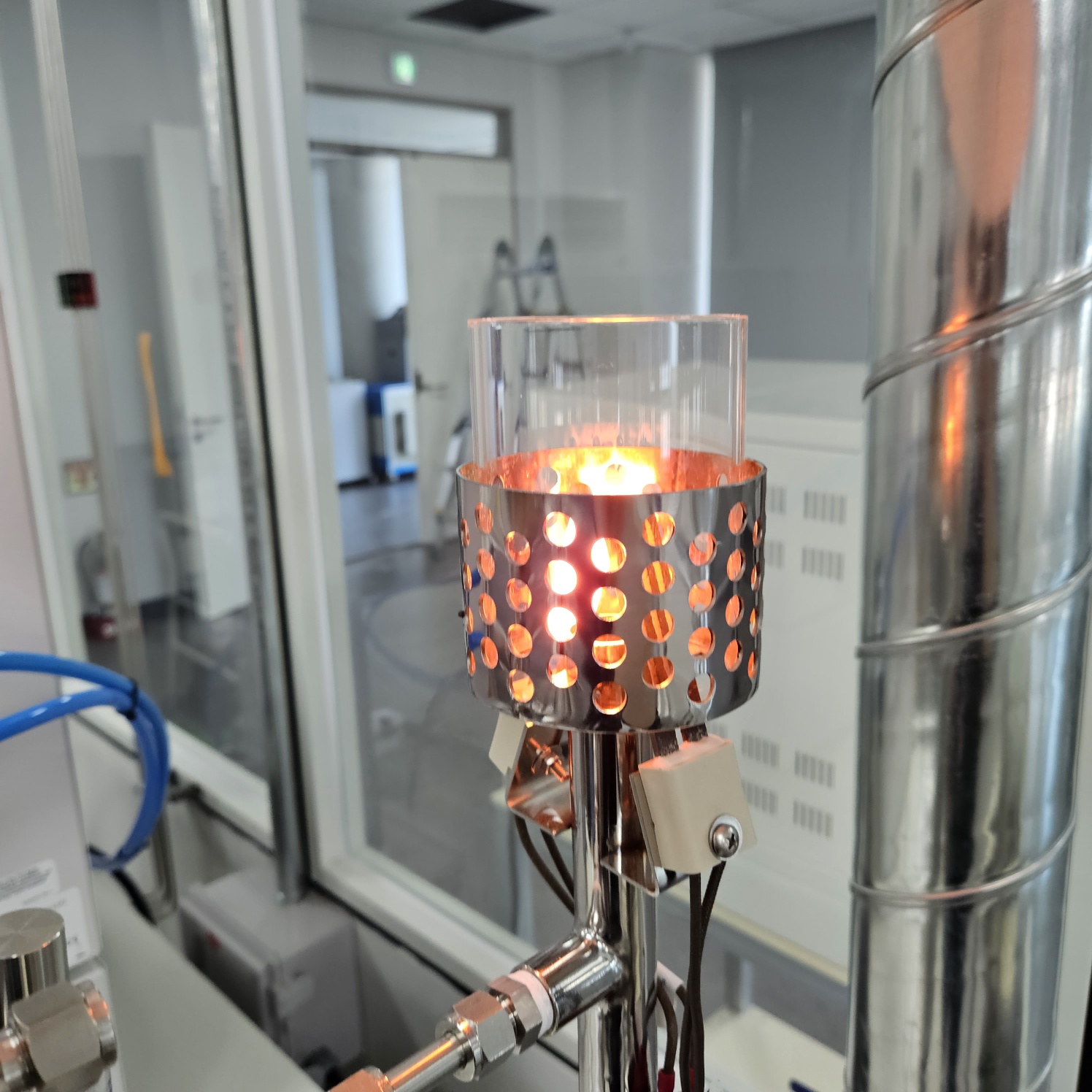 최대온도 1500도의 Lindberg/Blue M General Purpose Tube Furnace에 고객의 사양에 부합하도록 MFC gas control 및 진공 컨트롤을 함께 일체형 테이블 타입으로 제작된 시스템 장비. 실험공정을 위해 주입하는 가연성 가스 연소를 위해 번아웃 시스템을 추가하여 연구실에서의 안전한 실험을 가능케 함.
